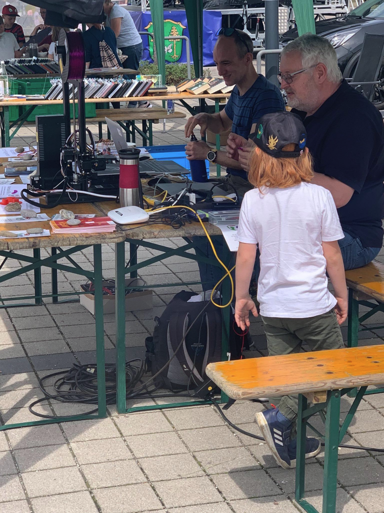 Das Wetter hat uns nicht um Stich gelassen, es war ein sonniger Sonntag auf dem Energie- und Umwelttag Kirchseeon. Der EDEKA-Parkplatz in Eglharting war von der Gemeinde Kirchseeon als Standort zur Verfügung gestellt worden und wir haben teilgenommen. Schaustücke wie der Fahrrad-Abstandssensor des ADFC München, die Vogelgezwitscher-Erkennung auf einem Raspberry Pi oder ein kleiner Servoplotter zeigten ein bisschen unseres Spektrums. Dazu noch die Möglichkeit, sich auf einem 3D-Drucker Schlüsselanhänger mit Vornamen erstellen zu lassen – besonders Kinder nahmen es rege in Anspruch. Uns wurde zum Schluss regelrecht der Strom abgeklemmt…